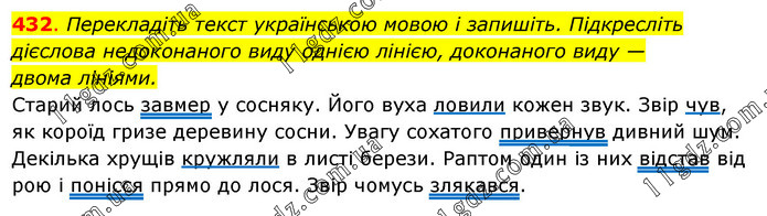 Перекладіть текст українською мовою і запишіть. Підкресліть дієслова недоконаного виду однією лінією, доконаного виду — двома лініями. Старий лось завмер у сосняку. Його вуха ловили кожен звук. Звір чув, як короїд гризе деревину сосни. Увагу сохатого привернув дивний шум. Декілька хрущів кружляли в листі берези. Раптом один із них відстав від рою і понісся прямо до лося. Звір чомусь злякався.