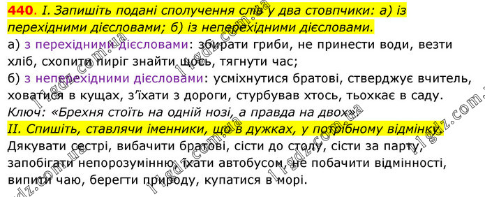 І. Запишіть подані сполучення слів у два стовпчики: а) із перехідними дієсловами; б) із неперехідними дієсловами. а) з перехідними дієсловами: збирати гриби, не принести води, везти хліб, схопити пиріг знайти щось, тягнути час; б) з неперехідними дієсловами: усміхнутися братові, стверджує вчитель, ховатися в кущах, з’їхати з дороги, стурбував хтось, тьохкає в саду. Ключ: «Брехня стоїть на одній нозі, а правда на двох». II. Спишіть, ставлячи іменники, що в дужках, у потрібному відмінку. Дякувати сестрі, вибачити братові, сісти до столу, сісти за парту, запобігати непорозумінню, їхати автобусом, не побачити відмінності, випити чаю, берегти природу, купатися в морі.