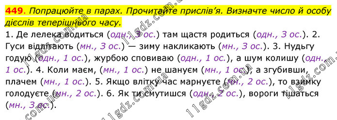 Попрацюйте в парах. Прочитайте прислів’я. Визначте число й особу дієслів теперішнього часу. 1. Де лелека водиться (одн., З ос.) там щастя родиться (одн., З ос.). 2. Гуси відлітають (мн., З ос.) — зиму накликають (мн., З ос.). 3. Нудьгу годую (одн., 1 ос.), журбою сповиваю (одн., 1 ос.), а шум колишу (одн., 1 ос.). 4. Коли маєм, (мн., 1 ос.) не шануєм (мн., 1 ос.), а згубивши, плачем (мн., 1 ос.). 5. Якщо влітку час марнуєте (мн., 2 ос.), то взимку голодуєте (мн., 2 ос.). 6. Як ти смутишся (одн., 2 ос.), вороги тішаться (мн., З ос.).