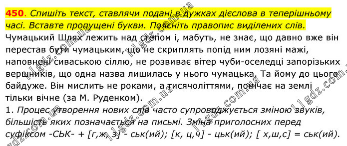 Спишіть текст, ставлячи подані в дужках дієслова в теперішньому часі. Вставте пропущені букви. Поясніть правопис виділених слів. Чумацький Шлях лежить над степом і, мабуть, не знає, що давно вже він перестав бути чумацьким, що не скриплять попід ним лозяні мажі, наповнені сиваською сіллю, не розвиває вітер чуби-оселедці запорізьких вершників, що одна назва лишилась у нього чумацька. Та йому до цього байдуже. Він мислить не роками, а тисячоліттями, помічає на землі тільки вічне (за М. Руденком). 1. Процес утворення нових слів часто супроводжується зміною звуків, більшість яких позначається на письмі. Зміна приголосних перед суфіксом -СЬК- + [г, ж, з] - ськ(ий); [к, ц, ч] - цьк(ий); [х, ш, с] = ськ(ий).