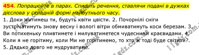 Попрацюйте в парах. Спишіть речення, ставлячи подані в дужках дієслова у складній формі майбутнього часу. 1. Доки житимеш ти, будуть квіти цвісти. 2. Почорнілі сніги зустрічатимуть знову весну і вологі вітри обмиватимуть коси березам. 3. Ви потихеньку пливтимете і милуватиметеся чудесними краєвидами. 4. Коли я не горітиму, коли Ми не горітимемо, то хто ж тоді буде світити?. 5. Дядько довго не мудруватиме.