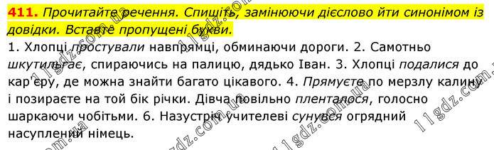 Прочитайте речення. Спишіть, замінюючи дієслово йти синонімом із довідки. Вставте пропущені букви. 1. Хлопці простували навпрямці, обминаючи дороги. 2. Самотньо шкутильгає, спираючись на палицю, дядько Іван. 3. Хлопці подалися до кар'єру, де можна знайти багато цікавого. 4. Прямуєте по мерзлу калину і позираєте на той бік річки. Дівча повільно пленталося, голосно шаркаючи чобітьми. 6. Назустріч учителеві сунувся огрядний насуплений німець.