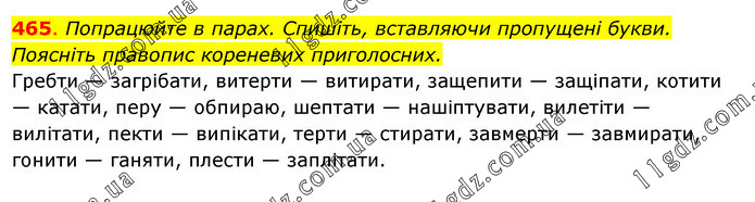 Попрацюйте в парах. Спишіть, вставляючи пропущені букви. Поясніть правопис кореневих приголосних. Гребти — загрібати, витерти — витирати, защепити — защіпати, котити — катати, перу — обпираю, шептати — нашіптувати, вилетіти — вилітати, пекти — випікати, терти — стирати, завмерти — завмирати, гонити — ганяти, плести — заплітати.