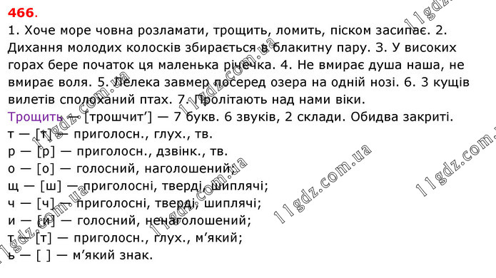 1. Хоче море човна розламати, трощить, ломить, піском засипає. 2. Дихання молодих колосків збирається в блакитну пару. З. У високих горах бере початок ця маленька річечка. 4. Не вмирає душа наша, не вмирає воля. 5. Лелека завмер посеред озера на одній нозі. 6. 3 кущів вилетів сполоханий птах. 7. Пролітають над нами віки. Трощить — [трошчит’] — 7 букв. 6 звуків, 2 склади. Обидва закриті. т — [т] — приголосн., глух., тв. р — [р] — приголосн., дзвінк., тв. о — [о] — голосний, наголошений; щ — [ш] — приголосні, тверді, шиплячі; ч — [ч] — приголосні, тверді, шиплячі; и — [и] — голосний, ненаголошений; т — [т] — приголосн., глух., м’який; ь — [ ] — м’який знак.