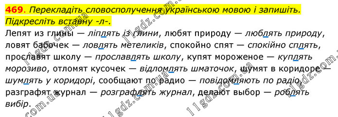 Перекладіть словосполучення українською мовою і запишіть. Підкресліть вставну -л-. Лепят из глины — ліплять із глини, любят природу — люблять природу, ловят бабочек — ловлять метеликів, спокойно спят — спокійно сплять, прославят школу — прославлять школу, купят мороженое — куплять морозиво, отломят кусочек — відломлять шматочок, шумят в коридоре — шумлять у коридорі, сообщают по радио — повідомляють по радіо, разграфят журнал — розграфлять журнал, делают выбор — роблять вибір.