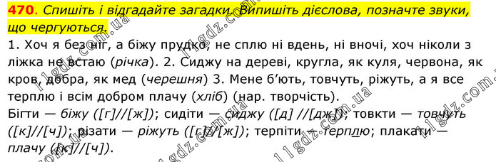 Спишіть і відгадайте загадки. Випишіть дієслова, позначте звуки, що чергуються. 1. Хоч я без ніг, а біжу прудко, не сплю ні вдень, ні вночі, хоч ніколи з ліжка не встаю (річка). 2. Сиджу на дереві, кругла, як куля, червона, як кров, добра, як мед (черешня) 3. Мене б’ють, товчуть, ріжуть, а я все терплю і всім добром плачу (хліб) (нар. творчість). Бігти — біжу ([г]//[ж]); сидіти — сиджу ([д] //[дж]); товкти — товчуть ([к]//[ч]); різати — ріжуть ([г]//[ж]); терпіти — терплю; плакати — плачу ([к]//[ч]).