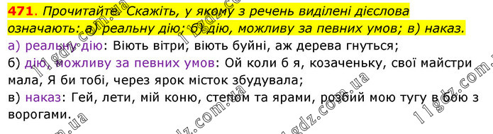 Прочитайте. Скажіть, у якому з речень виділені дієслова означають: а) реальну дію; б) дію, можливу за певних умов; в) наказ. а) реальну дію: Віють вітри, віють буйні, аж дерева гнуться; б) дію, можливу за певних умов: Ой коли б я, козаченьку, свої майстри мала, Я би тобі, через ярок місток збудувала; в) наказ: Гей, лети, мій коню, степом та ярами, розбий мою тугу в бою з ворогами.