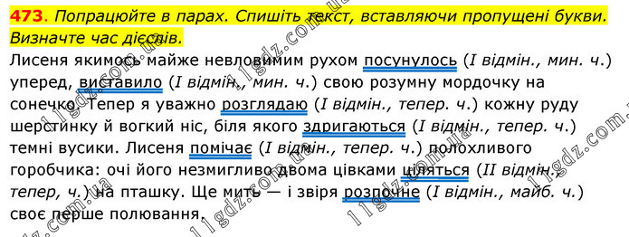 Попрацюйте в парах. Спишіть текст, вставляючи пропущені букви. Визначте час дієслів. Лисеня якимось майже невловимим рухом посунулось (І відмін., мин. ч.) уперед, виставило (І відмін., мин. ч.) свою розумну мордочку на сонечко. Тепер я уважно розглядаю (І відмін., тепер. ч.) кожну руду шерстинку й вогкий ніс, біля якого здригаються (І відмін., тепер. ч.) темні вусики. Лисеня помічає (І відмін., тепер. ч.) полохливого горобчика: очі його незмигливо двома цівками ціляться (II відмін., тепер, ч.) на пташку. Ще мить — і звіря розпочне (І відмін., майб. ч.) своє перше полювання.