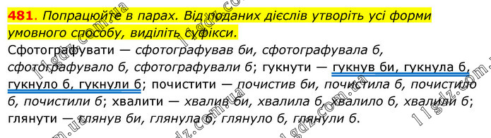 Попрацюйте в парах. Від поданих дієслів утворіть усі форми умовного способу, виділіть суфікси. Сфотографувати — сфотографував би, сфотографувала б, сфотографувало б, сфотографували б; гукнути — гукнув би, гукнула б, гукнуло б, гукнули б; почистити — почистив би, почистила б, почистило б, почистили б; хвалити — хвалив би, хвалила б, хвалило б, хвалили б; глянути — глянув би, глянула б, глянуло б, глянули б.