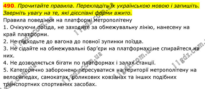 Прочитайте правила. Перекладіть їх українською мовою і запишіть. Зверніть увагу на те, які дієслівні форми вжито. Правила поведінки на платформі метрополітену 1. Очікуючи поїзда, не заходите за обмежувальну лінію, нанесену на край платформи. 2. Не підходьте до вагона до повної зупинки поїзда. 3. Не сідайте на обмежувальні бар’єри на платформах, не спирайтеся на них. 4. Не дозволяється бігати по платформах і залах станції. 5. Категорично заборонено пересуватися на території метрополітену на велосипедах, самокатах, роликових ковзанах та інших подібних транспортних спортивних засобах.