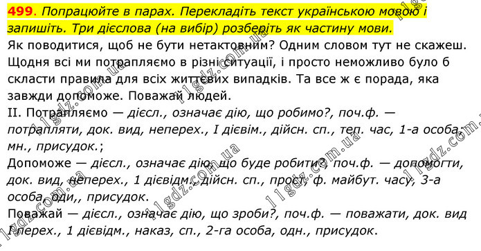 Попрацюйте в парах. Перекладіть текст українською мовою і запишіть. Три дієслова (на вибір) розберіть як частину мови. Як поводитися, щоб не бути нетактовним? Одним словом тут не скажеш. Щодня всі ми потрапляємо в різні ситуації, і просто неможливо було б скласти правила для всіх життєвих випадків. Та все ж є порада, яка завжди допоможе. Поважай людей. II. Потрапляємо — дієсл., означає дію, що робимо?, поч.ф. — потрапляти, док. вид, неперех., І дієвім., дійсн. сп., теп. час, 1-а особа; мн., присудок.; Допоможе — дієсл., означає дію, що буде робити?, поч.ф. — допомогти, док. вид, неперех., 1 дієвідм., дійсн. сп., прост, ф. майбут. часу, 3-а особа, оди,, присудок. Поважай — дієсл., означає дію, що зроби?, поч.ф. — поважати, док. вид І перех., 1 дієвідм., наказ, сп., 2-га особа, одн., присудок.