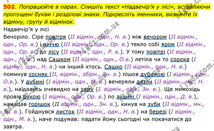 Попрацюйте в парах. Спишіть текст «Надвечір’я у лісі», вставляючи пропущені букви і розділові знаки. Підкресліть іменники, визначте їх відміну, групу й відмінок. Надвечір’я у лісі Вечоріло. Сіре повітря (II відмін., одн., Н. в.) між вечором (II відмін., одн., Ор. в.) і ніччю (III відмін., одн., Ор. в.) текло собі яром (II відмін., одн., Ор. в.) до лісу (II відмін., одн., Р. в.). У тому повітрі (II відмін., одн., М. в.) над Сашком (II відмін., одн., O.в.) летіла чи то сорока (І відмін., одн., Н. в.) чи інший хтось. Сашко (II відмін., оди., Н. в.) поминув сосняк (II, відмін., збірн., Зн. в.) пішов дубиною (І відмін., одн.. O.в.). У дубині (І відмін., одн., М. в.) вечеряли дятли (II відмін., мн., Н. в.), наїдались очевидно на зиму (І. відмін., одн., Зн. в.). Ще мимохідь провів рукою (І відмін,, одн., Ор. в.) по ліщині (І відмін., одн., Д. в.), намацав горішок (ІІ відмін., одн., Зн. в.), кинув на зуби (II відмін., мн., Зн. в.). Гойднувся листок (II відмін,, одн., Н. в.) на березі (І відмін., одн., М. в.), наче подумав: падати йому сьогодні чи покачатися до завтра.