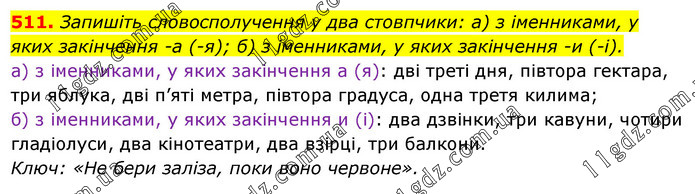 Запишіть словосполучення у два стовпчики: а) з іменниками, у яких закінчення -а (-я); б) з іменниками, у яких закінчення -и (-і). а) з іменниками, у яких закінчення а (я): дві треті дня, півтора гектара, три яблука, дві п’яті метра, півтора градуса, одна третя килима; б) з іменниками, у яких закінчення и (і): два дзвінки, три кавуни, чотири гладіолуси, два кінотеатри, два взірці, три балкони. Ключ: «Не бери заліза, поки воно червоне».