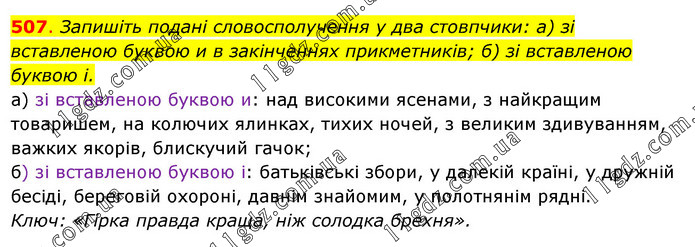 Запишіть подані словосполучення у два стовпчики: а) зі вставленою буквою и в закінченнях прикметників; б) зі вставленою буквою і. а) зі вставленою буквою и: над високими ясенами, з найкращим товаришем, на колючих ялинках, тихих ночей, з великим здивуванням, важких якорів, блискучий гачок; б) зі вставленою буквою і: батьківські збори, у далекій країні, у дружній бесіді, береговій охороні, давнім знайомим, у полотнянім рядні. Ключ: «Гірка правда краща, ніж солодка брехня».