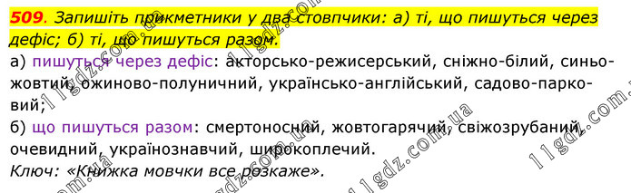 Запишіть прикметники у два стовпчики: а) ті, що пишуться через дефіс; б) ті, що пишуться разом. а) пишуться через дефіс: акторсько-режисерський, сніжно-білий, синьо-жовтий, ожиново-полуничний, українсько-англійський, садово-парко-вий; б) що пишуться разом: смертоносний, жовтогарячий, свіжозрубаний, очевидний, українознавчий, широкоплечий. Ключ: «Книжка мовчки все розкаже».