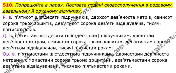 Попрацюйте в парах. Поставте подані словосполучення в родовому, давальному й орудному відмінках. Р. в. п'ятисот шістдесяти підручників, двохсот дев’яноста метрів, семисот сорока трьох зошитів, дев'ятисот сорока дев'яти відвідувачів, тисячі п’ятисот років. Д. в. п’ятистам шістдесяти (шістдесятьом) підручникам, двомстам дев'яноста метрам, семистам сорока трьом зошитам, дев'ятистам сорока дев’ятьом відвідувачам, тисячі п'ятистам рокам. Ор. в. п'ятьмастами шістдесятьма підручниками, двомастами дев'яноста метрами, сімомастами сорока трьома зошитами, дев’ятьмастами сорока дев’ятьма відвідувачами, тисячею п’ятьмастами роками.