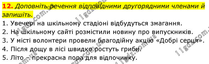 Доповніть речення відповідними другорядними членами й запишіть. 1. Увечері на шкільному стадіоні відбудуться змагання. 2. На шкільному сайті розмістили новину про випускників. 3. У місті волонтери провели благодійну акцію «Добрі серця». 4. Після дощу в лісі швидко ростуть гриби. 5. Літо – прекрасна пора для відпочинку.