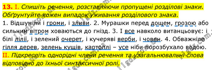 І. Спишіть речення, розставляючи пропущені розділові знаки. Обґрунтуйте кожен випадок уживання розділового знака. 1. Відшуміли і громи, і зливи. 2. Мурашки перед дощем, грозою або сильним вітром ховаються до гнізд. 3. І все навколо витанцьовує: і білі лілії, і зелений очерет, і кучеряві верби, і човен. 4. Обважніле гілля дерев, зелень кущів, картоплі – усе ніби порозбухало водою. II. Підкресліть однорідні члени речення та узагальнювальні слова відповідно до їхньої синтаксичної ролі.