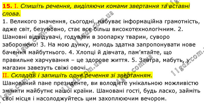І. Спишіть речення, виділяючи комами звертання та вставні слова. 1. Великого значення, сьогодні, набуває інформаційна грамотність, адже світ, безумовно, стає все більш високотехнологічним. 2. Шановні відвідувачі, годувати в зоопарку тварин, суворо заборонено! 3. На мою думку, молодь здатна запропонувати нове бачення майбутнього. 4. Хлопці й дівчата, пам’ятайте, що правильне харчування – це здорове життя. 5. Завтра, мабуть, у магазин завезуть свіжі овочі. II. Складіть і запишіть одне речення зі звертанням. Шанований пане президенте, ви володієте унікальною можливістю змінити майбутнє нашої країни. Шановані гості, будь ласко, займіть свої місця і насолоджуйтесь цим захоплюючим вечором.