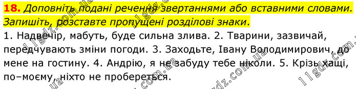 Доповніть подані речення звертаннями або вставними словами. Запишіть, розставте пропущені розділові знаки. 1. Надвечір, мабуть, буде сильна злива. 2. Тварини, зазвичай, передчувають зміни погоди. 3. Заходьте, Івану Володимирович, до мене на гостину. 4. Андрію, я не забуду тебе ніколи. 5. Крізь хащі, по–моєму, ніхто не пробереться.