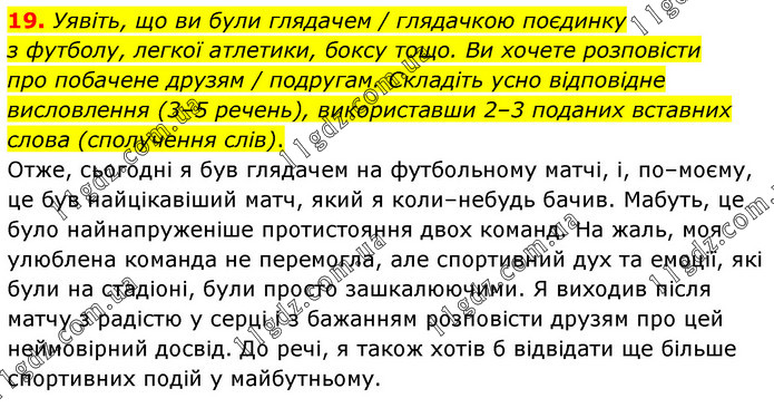 Уявіть, що ви були глядачем / глядачкою поєдинку з футболу, легкої атлетики, боксу тощо. Ви хочете розповісти про побачене друзям / подругам. Складіть усно відповідне висловлення (3–5 речень), використавши 2–3 поданих вставних слова (сполучення слів). Отже, сьогодні я був глядачем на футбольному матчі, і, по–моєму, це був найцікавіший матч, який я коли–небудь бачив. Мабуть, це було найнапруженіше протистояння двох команд. На жаль, моя улюблена команда не перемогла, але спортивний дух та емоції, які були на стадіоні, були просто зашкалюючими. Я виходив після матчу з радістю у серці і з бажанням розповісти друзям про цей неймовірний досвід. До речі, я також хотів б відвідати ще більше спортивних подій у майбутньому.