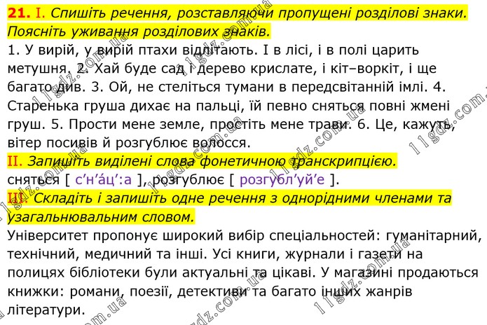 І. Спишіть речення, розставляючи пропущені розділові знаки. Поясніть уживання розділових знаків. 1. У вирій, у вирій птахи відлітають. І в лісі, і в полі царить метушня. 2. Хай буде сад і дерево крислате, і кіт–воркіт, і ще багато див. 3. Ой, не стеліться тумани в передсвітанній імлі. 4. Старенька груша дихає на пальці, їй певно сняться повні жмені груш. 5. Прости мене земле, простіть мене трави. 6. Це, кажуть, вітер посивів й розгублює волосся. II. Запишіть виділені слова фонетичною транскрипцією. сняться [ с’н’а́ц’:а ], розгублює [ розгубл’уй’е ]. III. Складіть і запишіть одне речення з однорідними членами та узагальнювальним словом. Університет пропонує широкий вибір спеціальностей: гуманітарний, технічний, медичний та інші. Усі книги, журнали і газети на полицях бібліотеки були актуальні та цікаві. У магазині продаються книжки: романи, поезії, детективи та багато інших жанрів літератури.