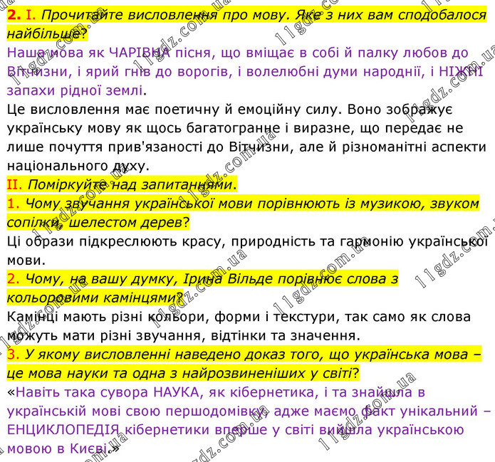 І. Прочитайте висловлення про мову. Яке з них вам сподобалося найбільше? Наша мова як ЧАРІВНА пісня, що вміщає в собі й палку любов до Вітчизни, і ярий гнів до ворогів, і волелюбні думи народнії, і НІЖНІ запахи рідної землі. Це висловлення має поетичну й емоційну силу. Воно зображує українську мову як щось багатогранне і виразне, що передає не лише почуття прив'язаності до Вітчизни, але й різноманітні аспекти національного духу. II. Поміркуйте над запитаннями. 1. Чому звучання української мови порівнюють із музикою, звуком сопілки, шелестом дерев? Ці образи підкреслюють красу, природність та гармонію української мови. 2. Чому, на вашу думку, Ірина Вільде порівнює слова з кольоровими камінцями? Камінці мають різні кольори, форми і текстури, так само як слова можуть мати різні звучання, відтінки та значення. 3. У якому висловленні наведено доказ того, що українська мова – це мова науки та одна з найрозвиненіших у світі? «Навіть така сувора НАУКА, як кібернетика, і та знайшла в українській мові свою першодомівку, адже маємо факт унікальний – ЕНЦИКЛОПЕДІЯ кібернетики вперше у світі вийшла українською мовою в Києві.»