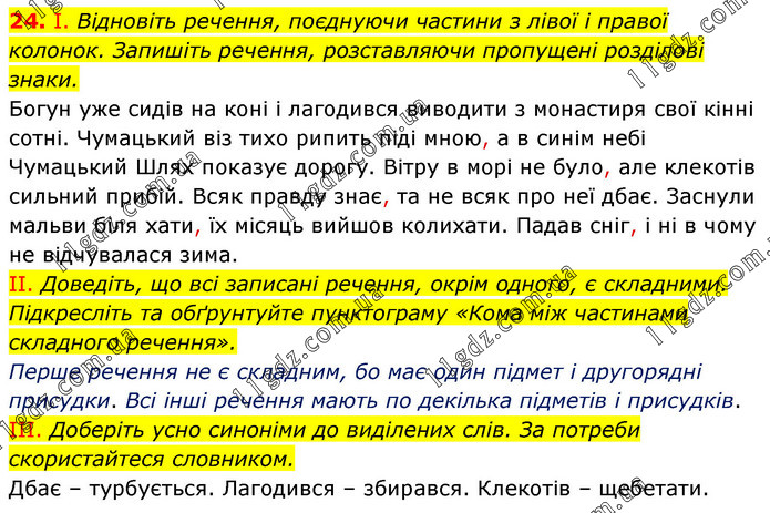І. Відновіть речення, поєднуючи частини з лівої і правої колонок. Запишіть речення, розставляючи пропущені розділові знаки. Богун уже сидів на коні і лагодився виводити з монастиря свої кінні сотні. Чумацький віз тихо рипить піді мною, а в синім небі Чумацький Шлях показує дорогу. Вітру в морі не було, але клекотів сильний прибій. Всяк правду знає, та не всяк про неї дбає. Заснули мальви біля хати, їх місяць вийшов колихати. Падав сніг, і ні в чому не відчувалася зима. II. Доведіть, що всі записані речення, окрім одного, є складними. Підкресліть та обґрунтуйте пунктограму «Кома між частинами складного речення». Перше речення не є складним, бо має один підмет і другорядні присудки. Всі інші речення мають по декілька підметів і присудків. III. Доберіть усно синоніми до виділених слів. За потреби скористайтеся словником. Дбає – турбується. Лагодився – збирався. Клекотів – щебетати.