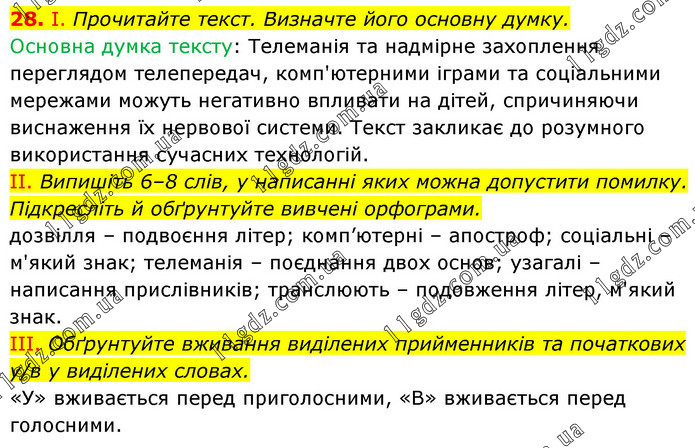 І. Прочитайте текст. Визначте його основну думку. Основна думка тексту: Телеманія та надмірне захоплення переглядом телепередач, комп'ютерними іграми та соціальними мережами можуть негативно впливати на дітей, спричиняючи виснаження їх нервової системи. Текст закликає до розумного використання сучасних технологій. II. Випишіть 6–8 слів, у написанні яких можна допустити помилку. Підкресліть й обґрунтуйте вивчені орфограми. дозвілля – подвоєння літер; комп’ютерні – апостроф; соціальні – м'який знак; телеманія – поєднання двох основ; узагалі – написання прислівників; транслюють – подовження літер, м'який знак. III. Обґрунтуйте вживання виділених прийменників та початкових у/в у виділених словах. «У» вживається перед приголосними, «В» вживається перед голосними.