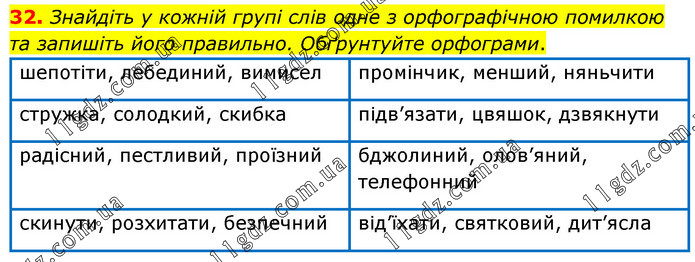Знайдіть у кожній групі слів одне з орфографічною помилкою та запишіть його правильно. Обґрунтуйте орфограми. шепотіти, лебединий, вимисел промінчик, менший, няньчити стружка, солодкий, скибка підв’язати, цвяшок, дзвякнути радісний, пестливий, проїзний бджолиний, олов’яний, телефонний скинути, розхитати, безпечний від’їхати, святковий, дит’ясла