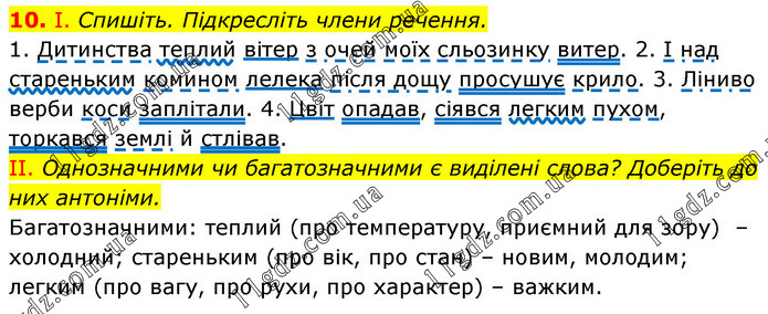 І. Спишіть. Підкресліть члени речення. 1. Дитинства теплий вітер з очей моїх сльозинку витер. 2. І над стареньким комином лелека після дощу просушує крило. 3. Ліниво верби коси заплітали. 4. Цвіт опадав, сіявся легким пухом, торкався землі й стлівав. II. Однозначними чи багатозначними є виділені слова? Доберіть до них антоніми. Багатозначними: теплий (про температуру, приємний для зору) – холодний; стареньким (про вік, про стан) – новим, молодим; легким (про вагу, про рухи, про характер) – важким.
