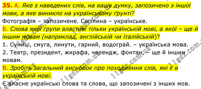 А. Яке з наведених слів, на вашу думку, запозичено з іншої мови, а яке виникло на українському ґрунті? Фотографія – запозичене. Світлина – українське. Б. Слова якої групи властиві тільки українській мові, а якої – ще й іншим мовам (наприклад, англійській чи італійській)? 1. Суниці, смуга, линути, гарний, водограй. – українська мова. 2. Театр, президент, жирафа, челендж, фонтан. – ще й іншим мовам. В. Зробіть загальний висновок про походження слів, які є в українській мові. Є власне українські слова та слова, що запозичені з інших мов.