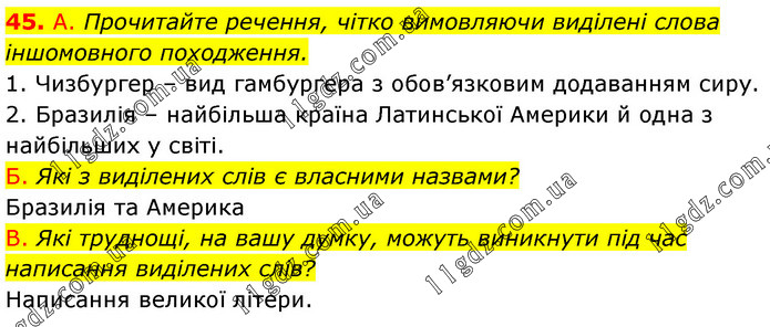 А. Прочитайте речення, чітко вимовляючи виділені слова іншомовного походження. 1. Чизбургер – вид гамбургера з обов’язковим додаванням сиру. 2. Бразилія – найбільша країна Латинської Америки й одна з найбільших у світі. Б. Які з виділених слів є власними назвами? Бразилія та Америка В. Які труднощі, на вашу думку, можуть виникнути під час написання виділених слів? Написання великої літери.