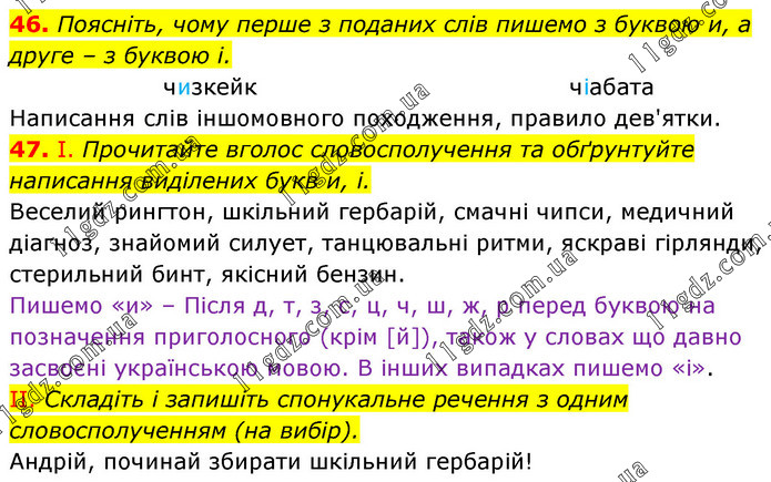 46. Поясніть, чому перше з поданих слів пишемо з буквою и, а друге – з буквою і. чизкейк чіабата Написання слів іншомовного походження, правило дев'ятки. 47. І. Прочитайте вголос словосполучення та обґрунтуйте написання виділених букв и, і. Веселий рингтон, шкільний гербарій, смачні чипси, медичний діагноз, знайомий силует, танцювальні ритми, яскраві гірлянди, стерильний бинт, якісний бензин. Пишемо «и» – Після д, т, з, с, ц, ч, ш, ж, р перед буквою на позначення приголосного (крім [й]), також у словах що давно засвоєні українською мовою. В інших випадках пишемо «і». II. Складіть і запишіть спонукальне речення з одним словосполученням (на вибір). Андрій, починай збирати шкільний гербарій!