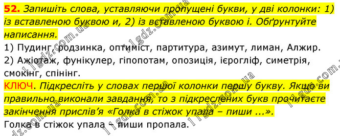 Запишіть слова, уставляючи пропущені букви, у дві колонки: 1) із вставленою буквою и, 2) із вставленою буквою і. Обґрунтуйте написання. 1) Пудинг, родзинка, оптиміст, партитура, азимут, лиман, Алжир. 2) Ажіотаж, фунікулер, гіпопотам, опозиція, ієрогліф, симетрія, смокінг, спінінг. КЛЮЧ. Підкресліть у словах першої колонки першу букву. Якщо ви правильно виконали завдання, то з підкреслених букв прочитаєте закінчення прислів’я «Голка в стіжок упала – пиши ...». Голка в стіжок упала – пиши пропала.