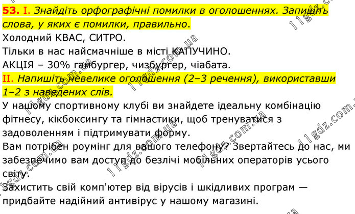 І. Знайдіть орфографічні помилки в оголошеннях. Запишіть слова, у яких є помилки, правильно. Холодний КВАС, СИТРО. Тільки в нас найсмачніше в місті КАПУЧИНО. АКЦІЯ – 30% гамбургер, чизбургер, чіабата. ІІ. Напишіть невелике оголошення (2–3 речення), використавши 1–2 з наведених слів. У нашому спортивному клубі ви знайдете ідеальну комбінацію фітнесу, кікбоксингу та гімнастики, щоб тренуватися з задоволенням і підтримувати форму. Вам потрібен роумінг для вашого телефону? Звертайтесь до нас, ми забезпечимо вам доступ до безлічі мобільних операторів усього світу. Захистить свій комп'ютер від вірусів і шкідливих програм — придбайте надійний антивірус у нашому магазині.