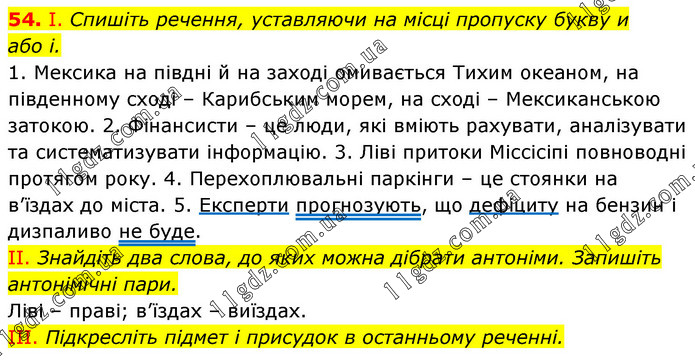 І. Спишіть речення, уставляючи на місці пропуску букву и або і. 1. Мексика на півдні й на заході омивається Тихим океаном, на південному сході – Карибським морем, на сході – Мексиканською затокою. 2. Фінансисти – це люди, які вміють рахувати, аналізувати та систематизувати інформацію. 3. Ліві притоки Міссісіпі повноводні протягом року. 4. Перехоплювальні паркінги – це стоянки на в’їздах до міста. 5. Експерти прогнозують, що дефіциту на бензин і дизпаливо не буде. II. Знайдіть два слова, до яких можна дібрати антоніми. Запишіть антонімічні пари. Ліві – праві; в’їздах – виїздах. III. Підкресліть підмет і присудок в останньому реченні.