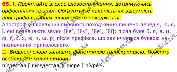 І. Прочитайте вголос словосполучення, дотримуючись орфоепічних правил. Обґрунтуйте наявність чи відсутність апострофа в словах іншомовного походження. Апостроф у словах іншомовного походження пишемо перед я, ю, є, ї, які позначають звуки [йа], [йу], [йе], [йі]: після букв б, п, в, м, ф, г, к, х, ж, ч, ш, р; після префікса, що закінчується буквою на позначення приголосного. II. Виділені слова запишіть фонетичною транскрипцією. Поясніть особливості їхньої вимови. п’єдестал [ пй’едестал ], пюре [ п’уре́ ].