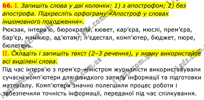 І. Запишіть слова у дві колонки: 1) з апострофом; 2) без апострофа. Підкресліть орфограму «Апостроф у словах іншомовного походження». Рюкзак, інтерв’ю, бюрократія, кювет, кар’єра, мюслі, прем’єра, бар’єр, манікюр, ад’ютант, п’єдестал, комп’ютер, бюджет, пюре, бюлетень. II. Складіть і запишіть текст (2–3 речення), у якому використайте всі виділені слова. Під час інтерв'ю з прем'єр–міністром журналісти використовували сучасні комп'ютери для швидкого запису інформації та підготовки матеріалу. Комп'ютери значно полегшили процес роботи і забезпечили точність інформації, переданої під час спілкування.