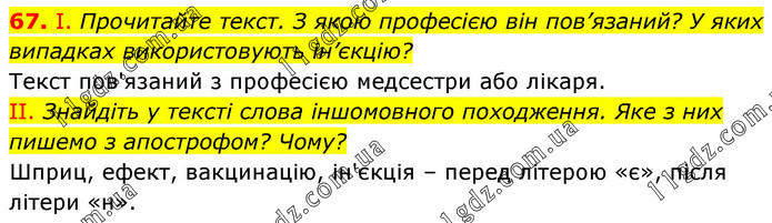 І. Прочитайте текст. З якою професією він пов’язаний? У яких випадках використовують ін’єкцію? Текст пов'язаний з професією медсестри або лікаря. II. Знайдіть у тексті слова іншомовного походження. Яке з них пишемо з апострофом? Чому? Шприц, ефект, вакцинацію, ін'єкція – перед літерою «є», після літери «н».