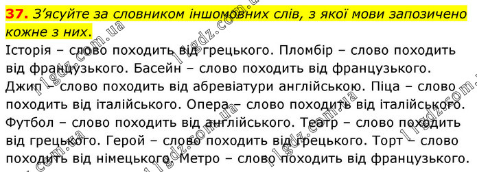 З’ясуйте за словником іншомовних слів, з якої мови запозичено кожне з них. Історія – слово походить від грецького. Пломбір – слово походить від французького. Басейн – слово походить від французького. Джип – слово походить від абревіатури англійською. Піца – слово походить від італійського. Опера – слово походить від італійського. Футбол – слово походить від англійського. Театр – слово походить від грецького. Герой – слово походить від грецького. Торт – слово походить від німецького. Метро – слово походить від французького.