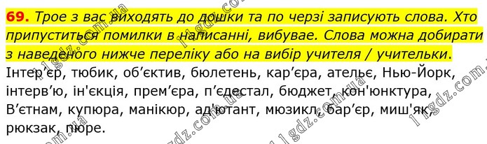 Трое з вас виходять до дошки та по черзi записують слова. Хто припуститься помилки в написаннi, вибувае. Слова можна добирати з наведеного нижче перелiку або на вибiр учителя / учительки. Інтер’єр, тюбик, об’єктив, бюлетень, кар’єра, ательє, Нью-Йорк, інтерв’ю, ін'єкція, прем’єра, п’єдестал, бюджет, кон'юнктура, В’єтнам, купюра, манікюр, ад'ютант, мюзикл, бар’єр, миш'як, рюкзак, пюре.