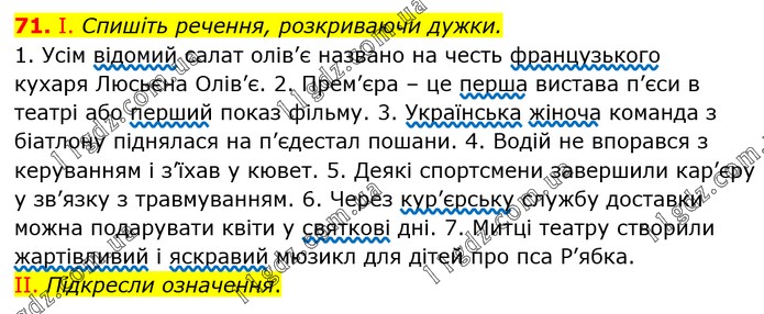 І. Спишіть речення, розкриваючи дужки. 1. Усім відомий салат олів’є названо на честь французького кухаря Люсьєна Олів’є. 2. Прем’єра – це перша вистава п’єси в театрі або перший показ фільму. 3. Українська жіноча команда з біатлону піднялася на п’єдестал пошани. 4. Водій не впорався з керуванням і з’їхав у кювет. 5. Деякі спортсмени завершили кар’єру у зв’язку з травмуванням. 6. Через кур’єрську службу доставки можна подарувати квіти у святкові дні. 7. Митці театру створили жартівливий і яскравий мюзикл для дітей про пса Р’ябка. ІІ. Підкресли означення.