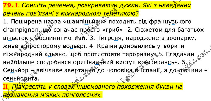 І. Спишіть речення, розкриваючи дужки. Які з наведених речень пов’язані з міжнародною тематикою? 1. Поширена назва «шампіньйон» походить від французького сhampignon, що означає просто «гриб». 2. Сюжетом для багатьох віньєток є рослинні мотиви. 3. Тигреня, народжене в зоопарку, живе в просторому вольєрі. 4. Країни домовились утворити міжнародний альянс, щоб протистояти тероризму. 5. Глядачам найбільше сподобався оригінальний виступ конферансьє. 6. Сеньйор – ввічливе звертання до чоловіка в Іспанії, а до дівчини – сеньйорита. II. Підкресліть у словах іншомовного походження букви на позначення м’яких приголосних.