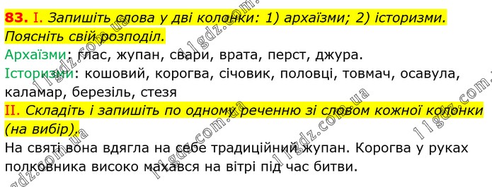 І. Запишіть слова у дві колонки: 1) архаїзми; 2) історизми. Поясніть свій розподіл. Архаїзми: глас, жупан, свари, врата, перст, джура. Історизми: кошовий, корогва, січовик, половці, товмач, осавула, каламар, березіль, стезя II. Складіть і запишіть по одному реченню зі словом кожної колонки (на вибір). На святі вона вдягла на себе традиційний жупан. Корогва у руках полковника високо махався на вітрі під час битви.