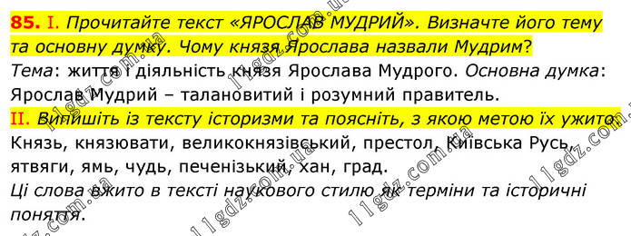 І. Прочитайте текст «ЯРОСЛАВ МУДРИЙ». Визначте його тему та основну думку. Чому князя Ярослава назвали Мудрим? Тема: життя і діяльність князя Ярослава Мудрого. Основна думка: Ярослав Мудрий – талановитий і розумний правитель. ІІ. Випишіть із тексту історизми та поясніть, з якою метою їх ужито. Князь, князювати, великокнязівський, престол, Київська Русь, ятвяги, ямь, чудь, печенізький, хан, град. Ці слова вжито в тексті наукового стилю як терміни та історичні поняття.