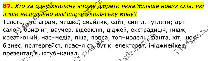 Хто за одну хвилину зможе дібрати якнайбільше нових слів, які лише нещодавно ввійшли в українську мову? Телега, Інстаграм, мишка, смайлик, сайт, сингл, гуглити; арт–салон, брифінг, ваучер, відеокліп, діджей, екстрадиція, імідж, креативний, мас–медіа, піца, попса, топ–модель, фанта, хіт, шоу–бізнес, полтергейст, прас–ліст, бутік, електорат, іміджмейкер, презентація, ютуб–канал.