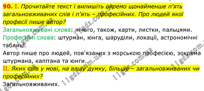 І. Прочитайте текст і випишіть окремо щонайменше п’ять загальновживаних слів і п’ять – професійних. Про людей якої професії пише автор? Загальновживані слова: нічого, також, карти, листки, пальцями. Професійні слова: штурман, юнга, шаруділи, локації, астрономічні таблиці. Автор пише про людей, пов'язаних з морською професією, зокрема штурмана, капітана та юнги. II. Яких слів у мові, на вашу думку, більше – загальновживаних чи професійних? Загальновживаних.