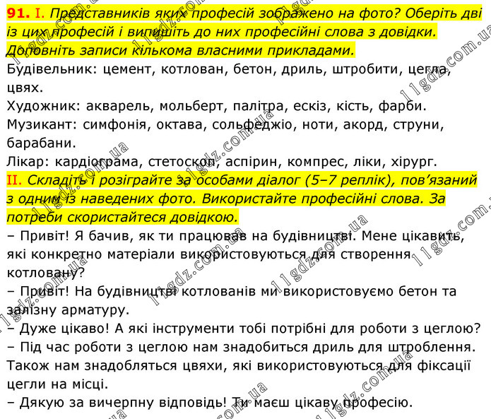 І. Представників яких професій зображено на фото? Оберіть дві із цих професій і випишіть до них професійні слова з довідки. Доповніть записи кількома власними прикладами. Будівельник: цемент, котлован, бетон, дриль, штробити, цегла, цвях. Художник: акварель, мольберт, палітра, ескіз, кість, фарби. Музикант: симфонія, октава, сольфеджіо, ноти, акорд, струни, барабани. Лікар: кардіограма, стетоскоп, аспірин, компрес, ліки, хірург. II. Складіть і розіграйте за особами діалог (5–7 реплік), пов’язаний з одним із наведених фото. Використайте професійні слова. За потреби скористайтеся довідкою. – Привіт! Я бачив, як ти працював на будівництві. Мене цікавить, які конкретно матеріали використовуються для створення котловану? – Привіт! На будівництві котлованів ми використовуємо бетон та залізну арматуру. – Дуже цікаво! А які інструменти тобі потрібні для роботи з цеглою? – Під час роботи з цеглою нам знадобиться дриль для штроблення. Також нам знадобляться цвяхи, які використовуються для фіксації цегли на місці. – Дякую за вичерпну відповідь! Ти маєш цікаву професію.