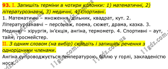 I. Запишіть терміни в чотири колонки: 1) математичні, 2) літературознавчі, 3) медичні, 4) спортивні. 1. Математичні – множення, дільник, квадрат, кут. 2. Літературознавчі – персонаж, поема, сюжет, драма, казка. 3. Медичні – хірургія, ін’єкція, ангіна, термометр. 4. Спортивні – аут, тайм, гросмейстер. ІІ. З одним словом (на вибір) складіть і запишіть речення з однорідними членами. Ангіна супроводжується температурою, біллю у горлі, закладеністю носа.